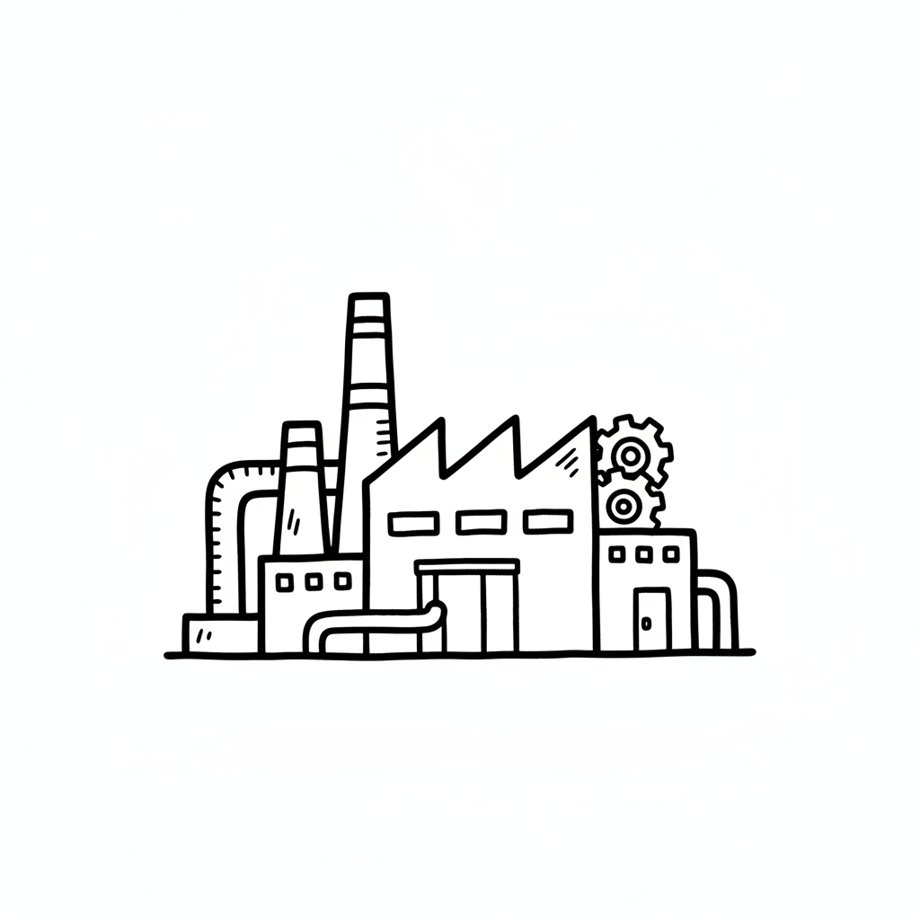 Schwarz-weiße Strichzeichnung einer Fabrik mit Schornsteinen, Rohren und Zahnrädern.