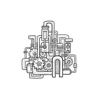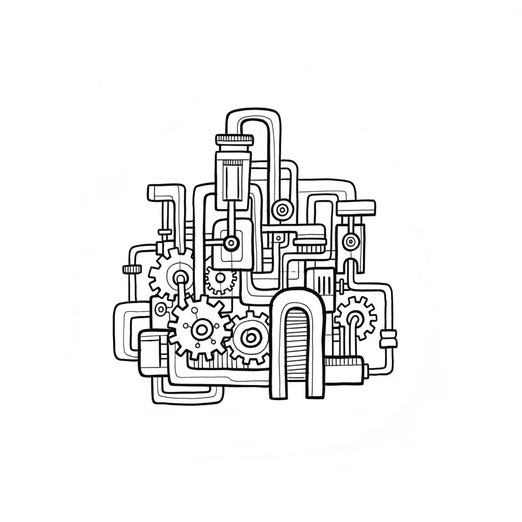 Abstrakte Schwarz-Weiß-Zeichnung einer komplexen Maschine aus Zahnrädern, Rohren und Kolben.