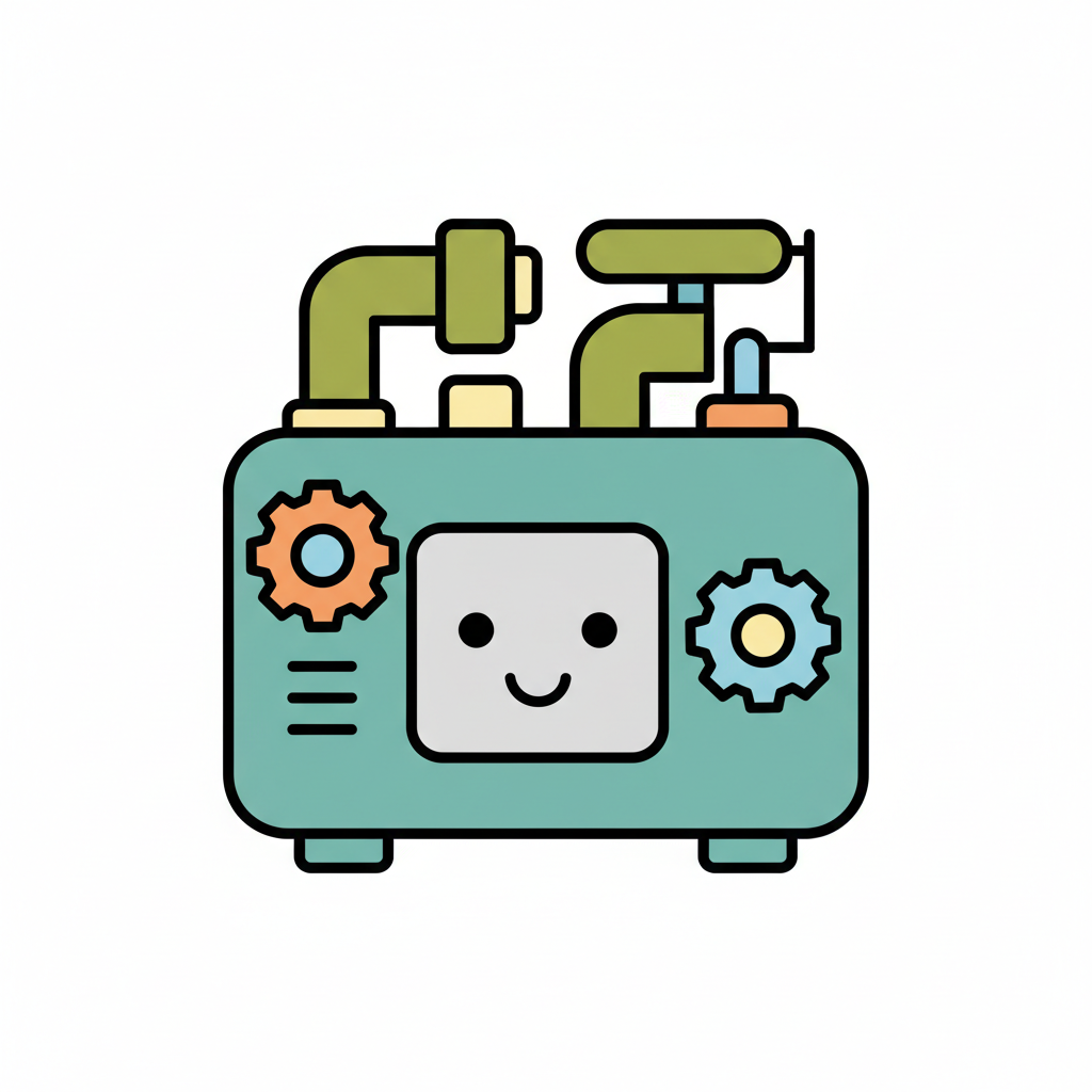Niedliche, cartoonartige Maschine mit Rohren, Zahnrädern und einem lächelnden Gesicht auf einem Bildschirm.