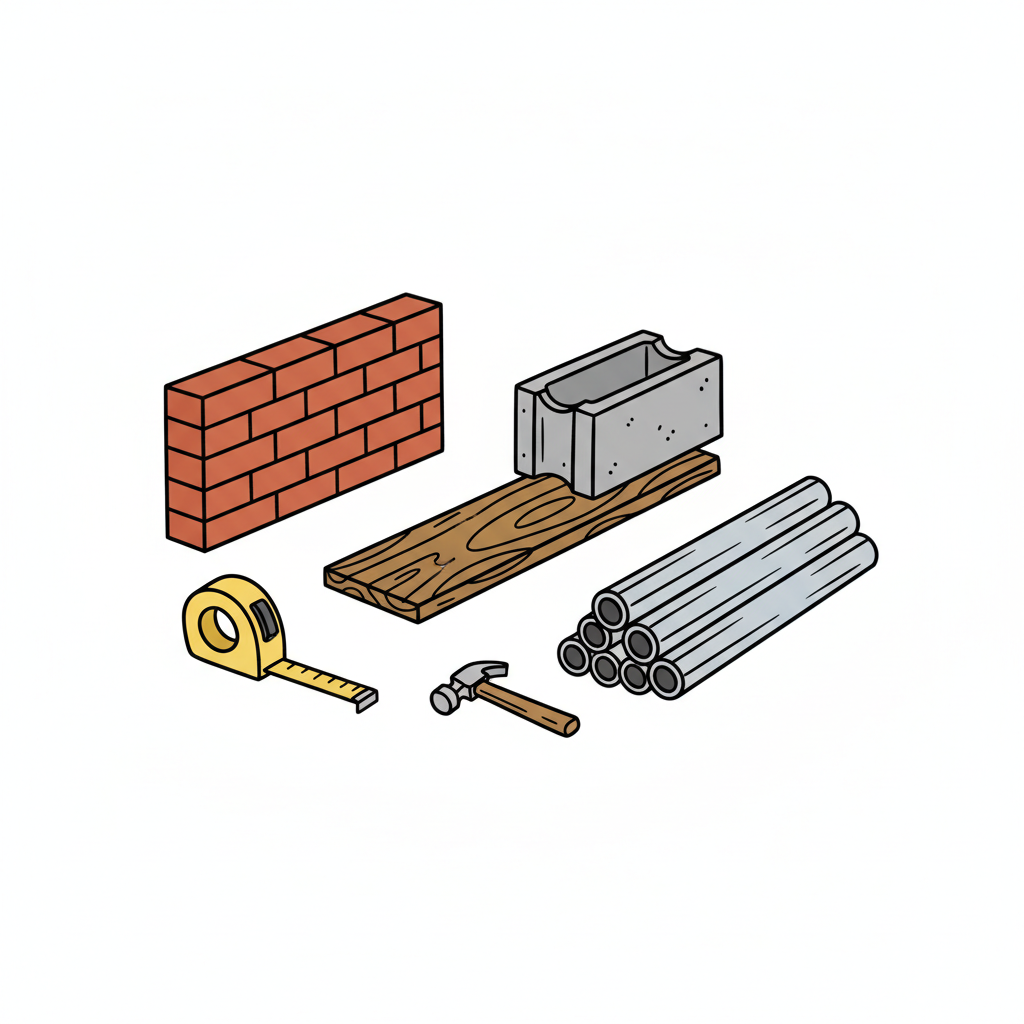 Illustration von Baumaterialien und Werkzeugen: Ziegel, Holz, Beton, Rohre, Maßband, Hammer.
