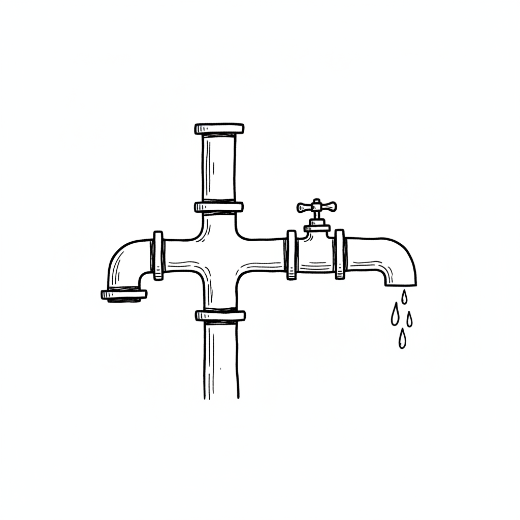 Handgezeichnete Illustration eines undichten Wasserhahns mit Rohren, aus dem Wasser tropft.