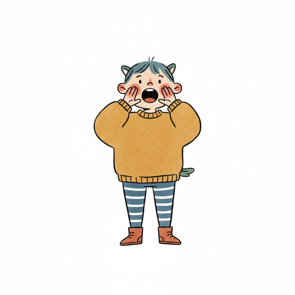 Niedliche Cartoon-Figur mit gelbem Pullover und Tierohren ruft laut mit Händen am Mund.