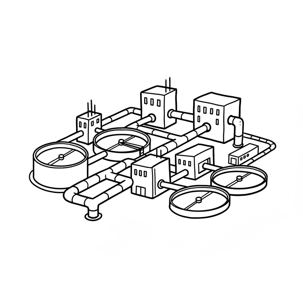 Isometrische Schwarz-Weiß-Zeichnung einer komplexen Industrieanlage mit Tanks, Gebäuden und Rohren.