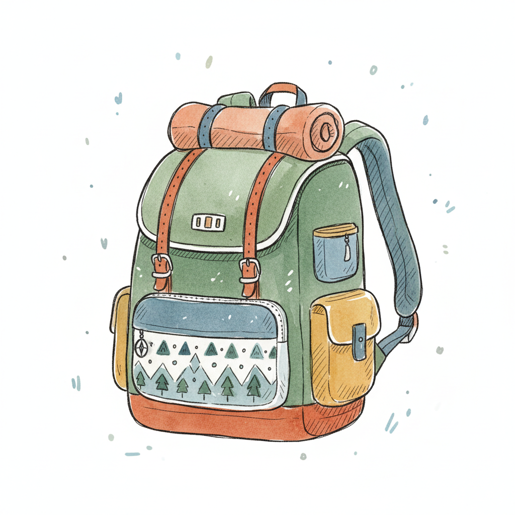 Grüner Wanderrucksack mit Baum-Muster und Rolle, im Aquarell-Stil illustriert.