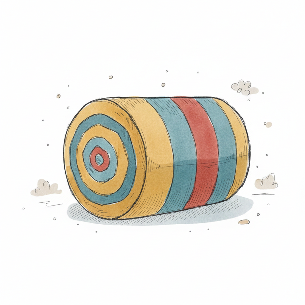 Aquarell-Illustration einer bunten, gestreiften Rolle oder eines Kissens in Gelb, Blau und Rot.