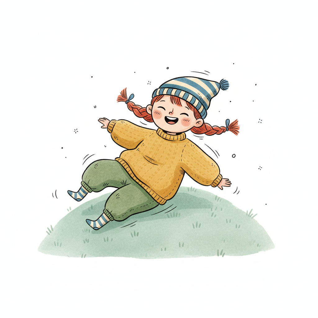 Fröhliches Cartoon-Mädchen mit Zöpfen und Mütze rutscht lachend einen grünen Hügel hinunter.