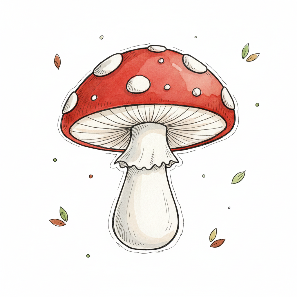 Niedlicher, rot-weißer Fliegenpilz im Cartoon-Stil mit kleinen Blättern und Punkten.