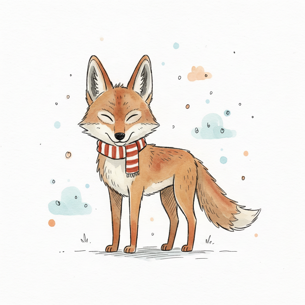 Niedlicher, lächelnder Fuchs mit rot-weißem Schal im Aquarell-Stil auf weißem Hintergrund.