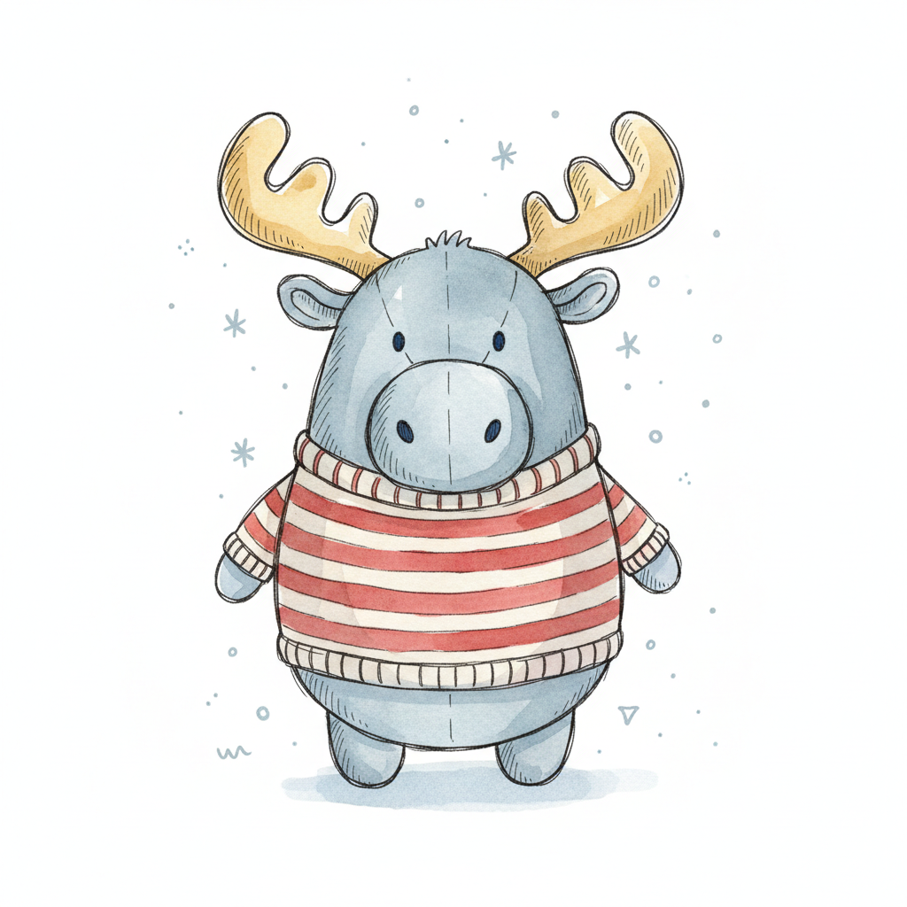 Niedlicher Elch im rot-weiß gestreiften Pullover, Aquarellstil, umgeben von Schneeflocken.