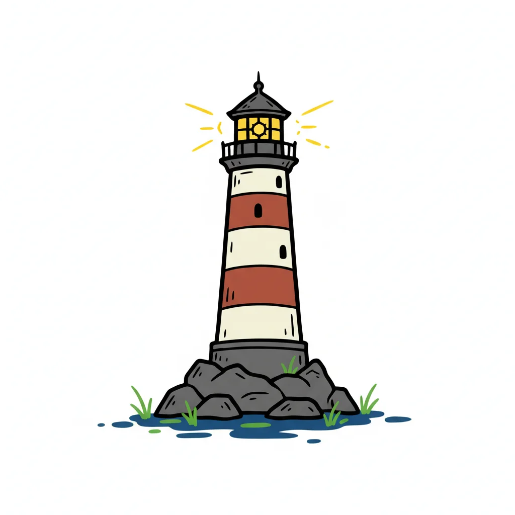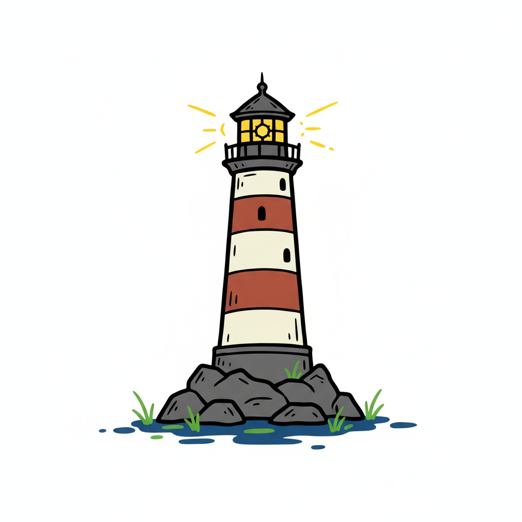 Cartoon-Stil Leuchtturm mit rot-weißen Streifen, der Licht ausstrahlt, auf Felsen am Wasser.
