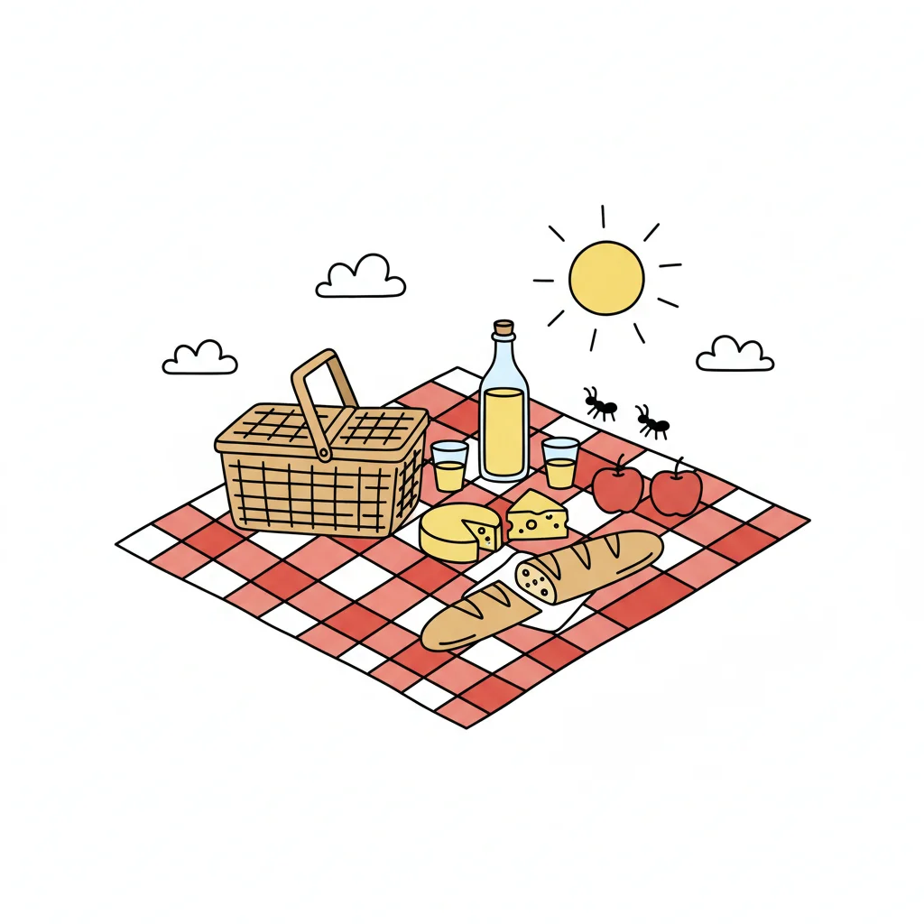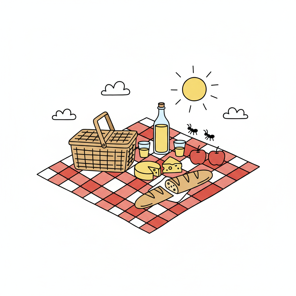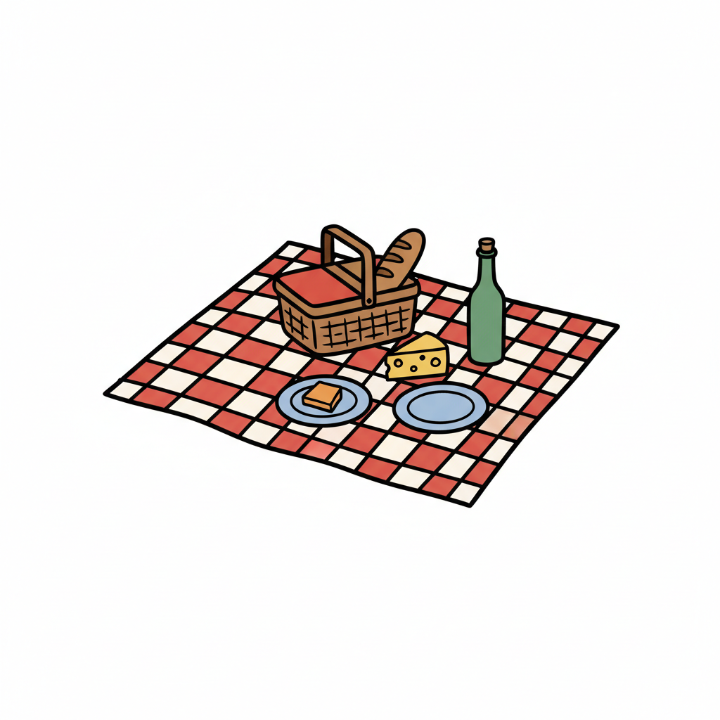 Cartoon-Picknick mit Korb, Baguette, Käse, Flasche und Tellern auf rot-weißer Decke.