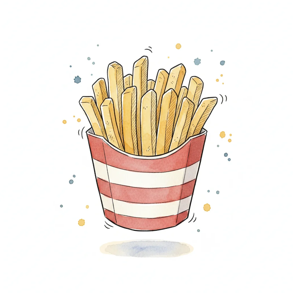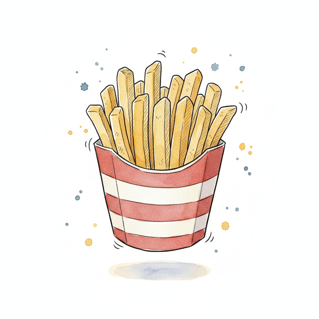 Aquarell-Illustration von Pommes Frites in einer rot-weiß gestreiften Tüte mit Farbspritzern.