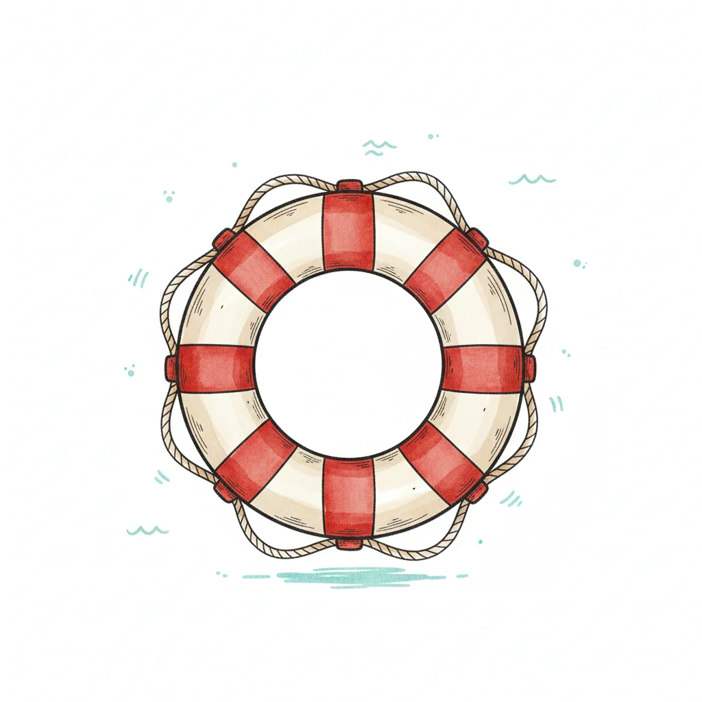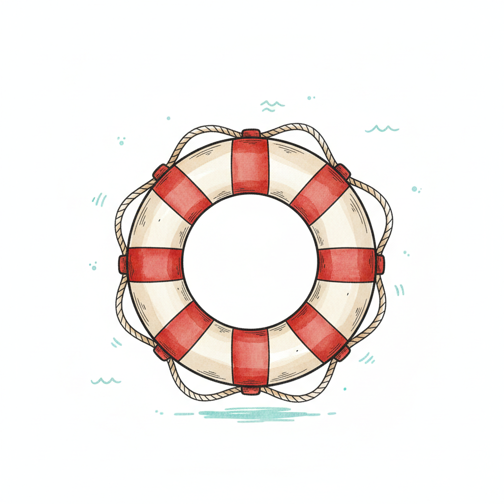 Handgezeichneter rot-weißer Rettungsring mit Seil, umgeben von stilisierten Wasserwellen.