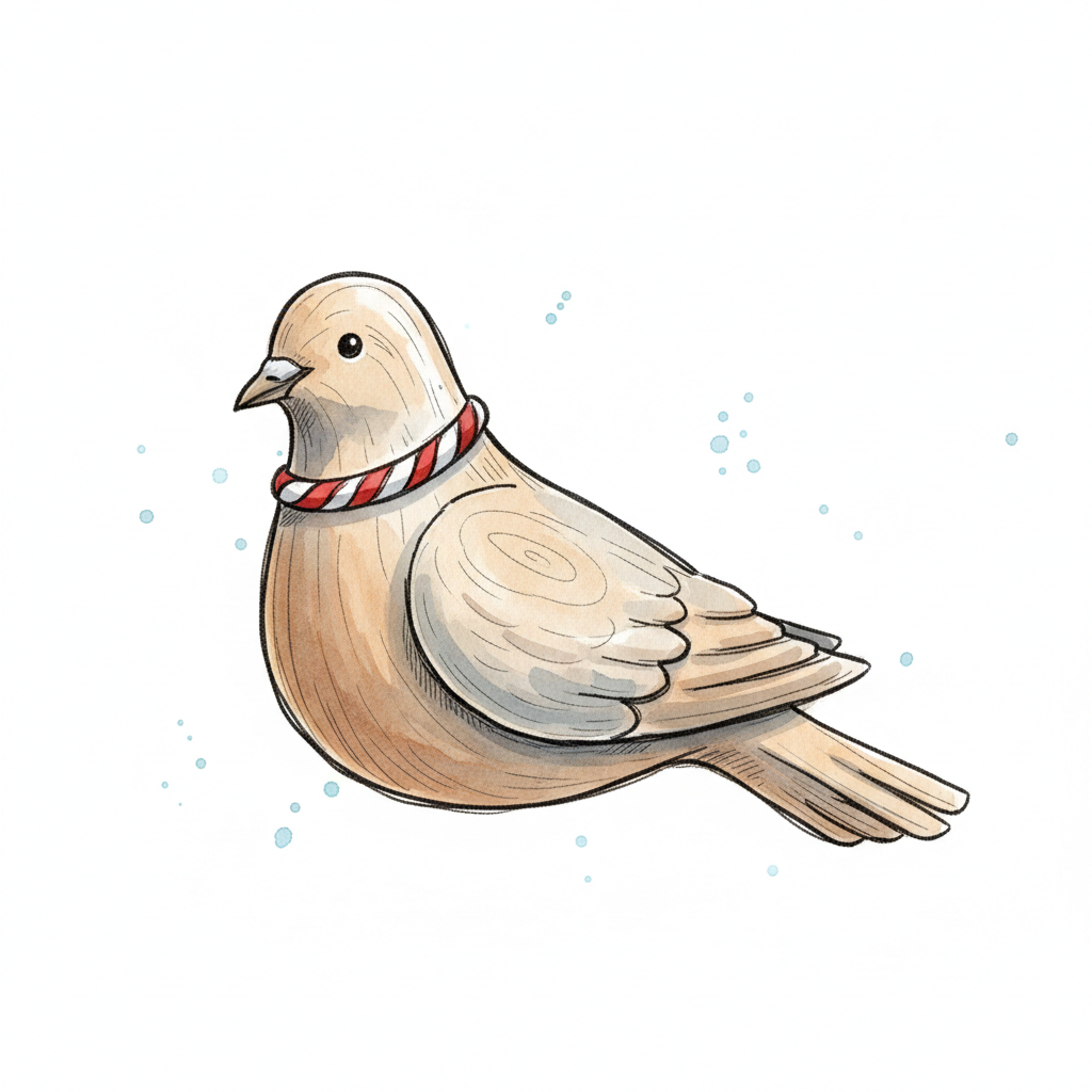 Illustration einer beigefarbenen Taube mit rot-weiß gestreiftem Halsband auf weißem Hintergrund.