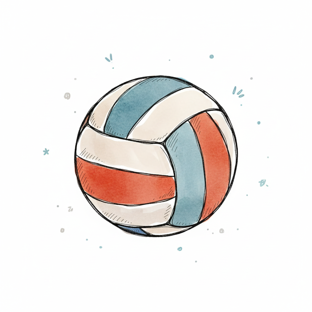 Skizzenhafte Aquarell-Illustration eines rot-weiß-blauen Volleyballs auf weißem Hintergrund.