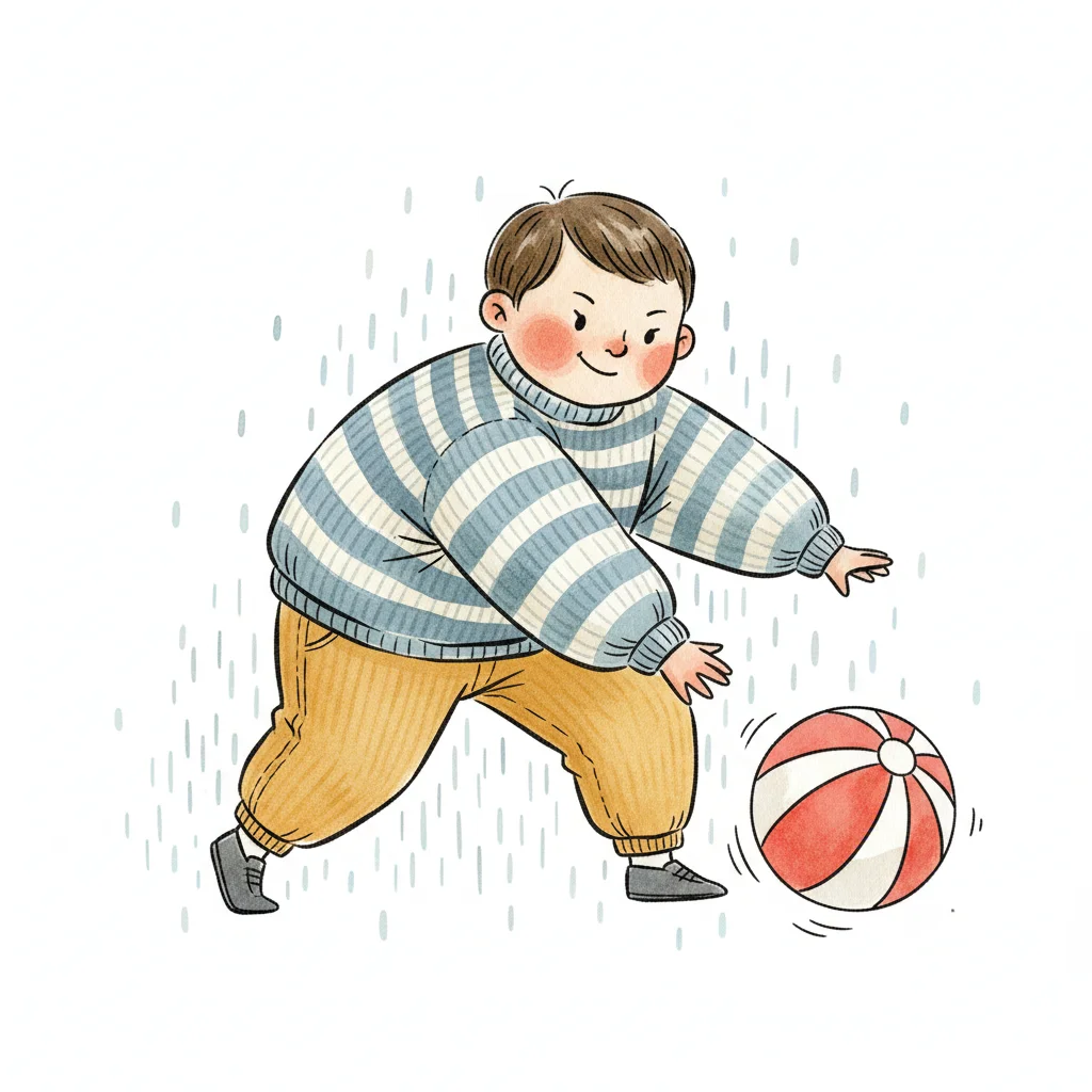 Cartoon-Junge in blau-weißem Pullover spielt mit einem rot-weißen Ball, im Hintergrund stilisierter Regen.