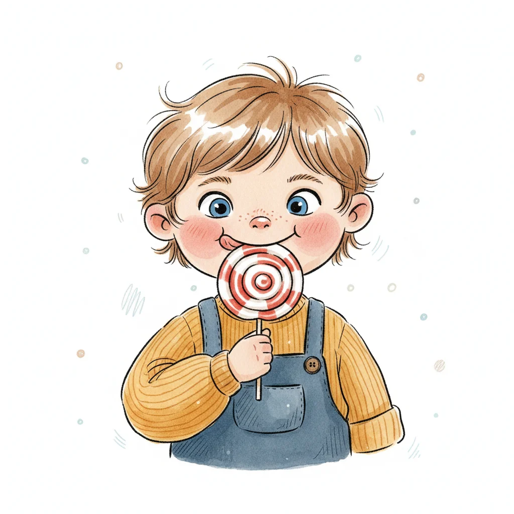 Niedlicher Cartoon-Junge mit blonden Haaren und blauen Augen, der einen rot-weißen Lutscher leckt.