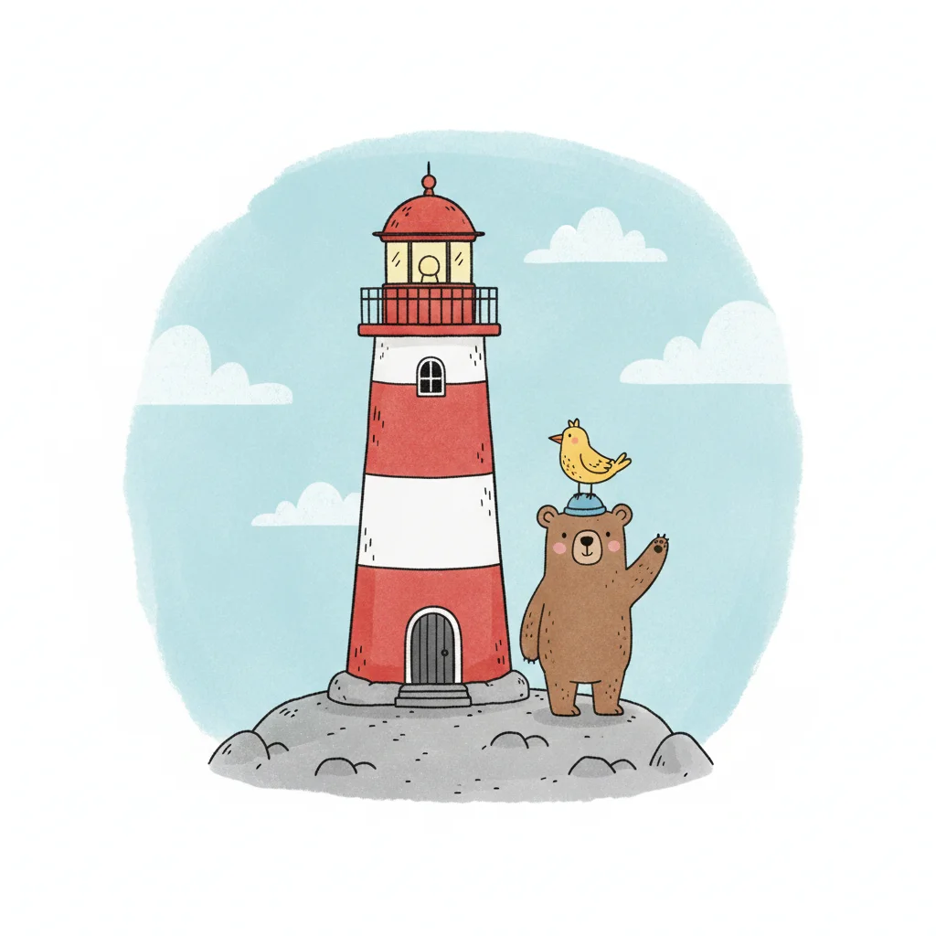 Niedliche Illustration: Bär mit Vogel auf dem Kopf winkt vor einem rot-weißen Leuchtturm.