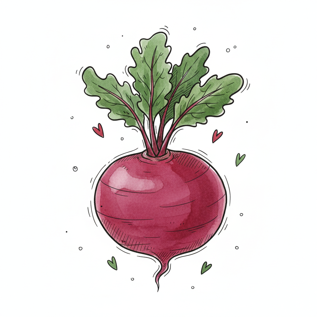 Eine rote Rübe mit grünen Blättern und kleinen Herzen um sie herum.