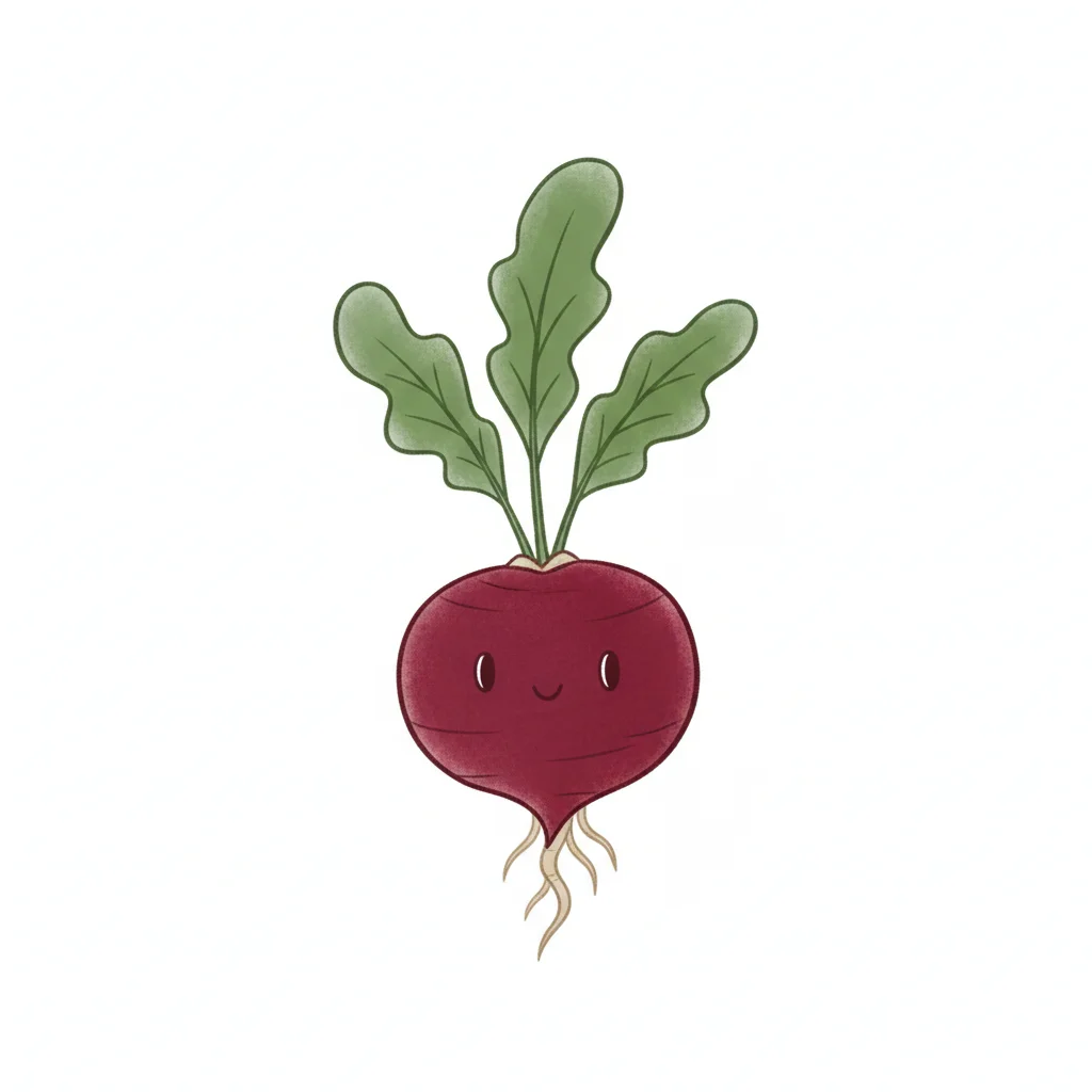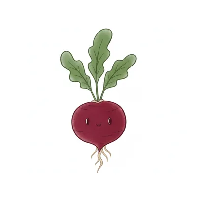 Eine fröhliche rote Rübe mit grünen Blättern und einem smilenden Gesicht.
