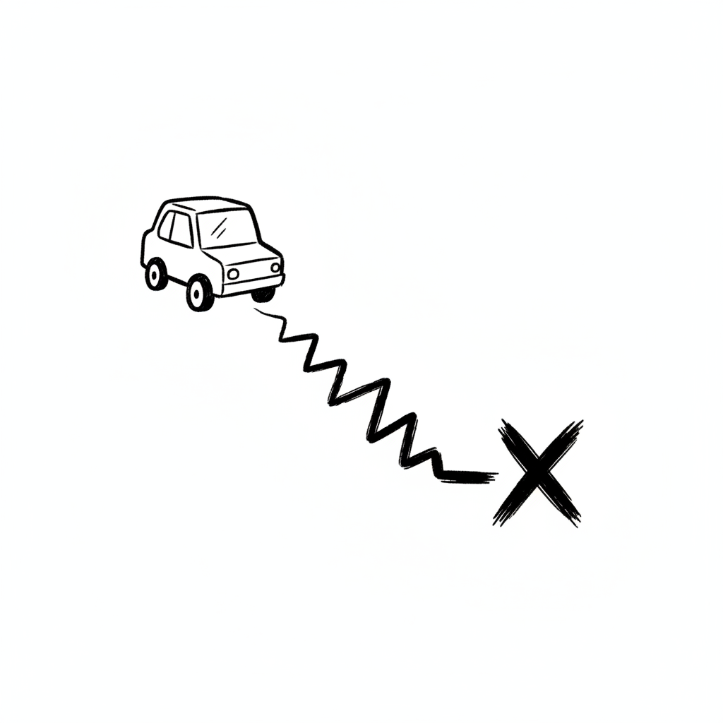 Ein gezeichnetes Auto folgt einer Zickzacklinie zu einem X. Symbolisiert Routenfindung oder Zielort.