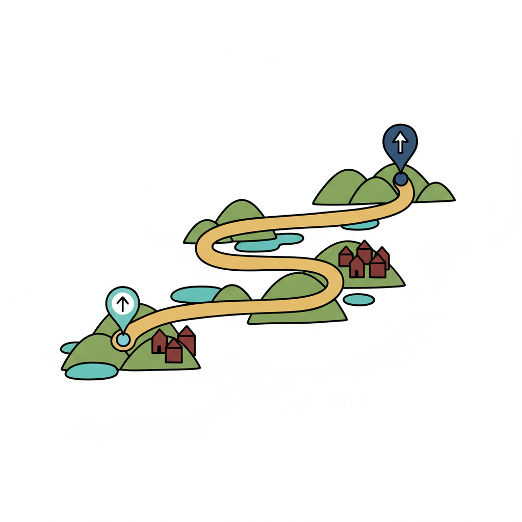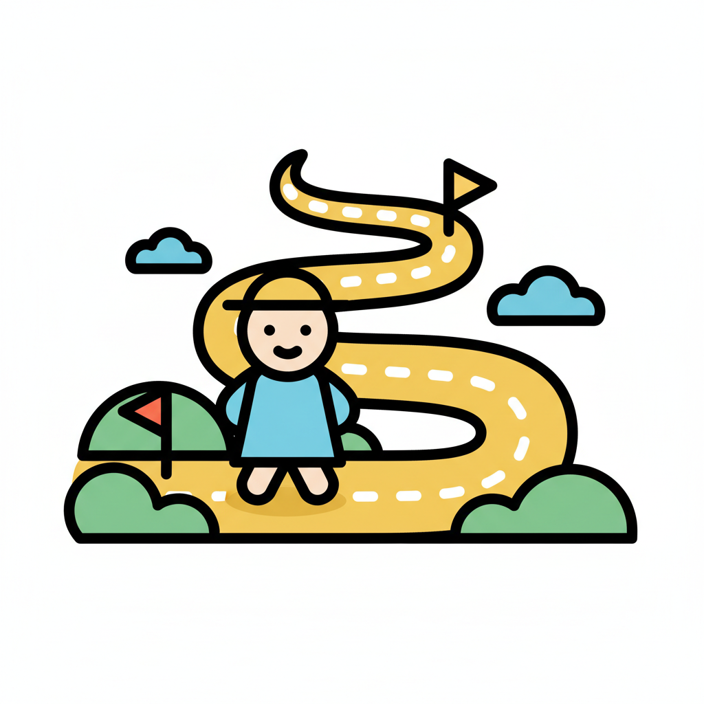 Cartoonfigur auf einem gewundenen Weg mit Start- und Zielflagge, umgeben von Wolken und Büschen.