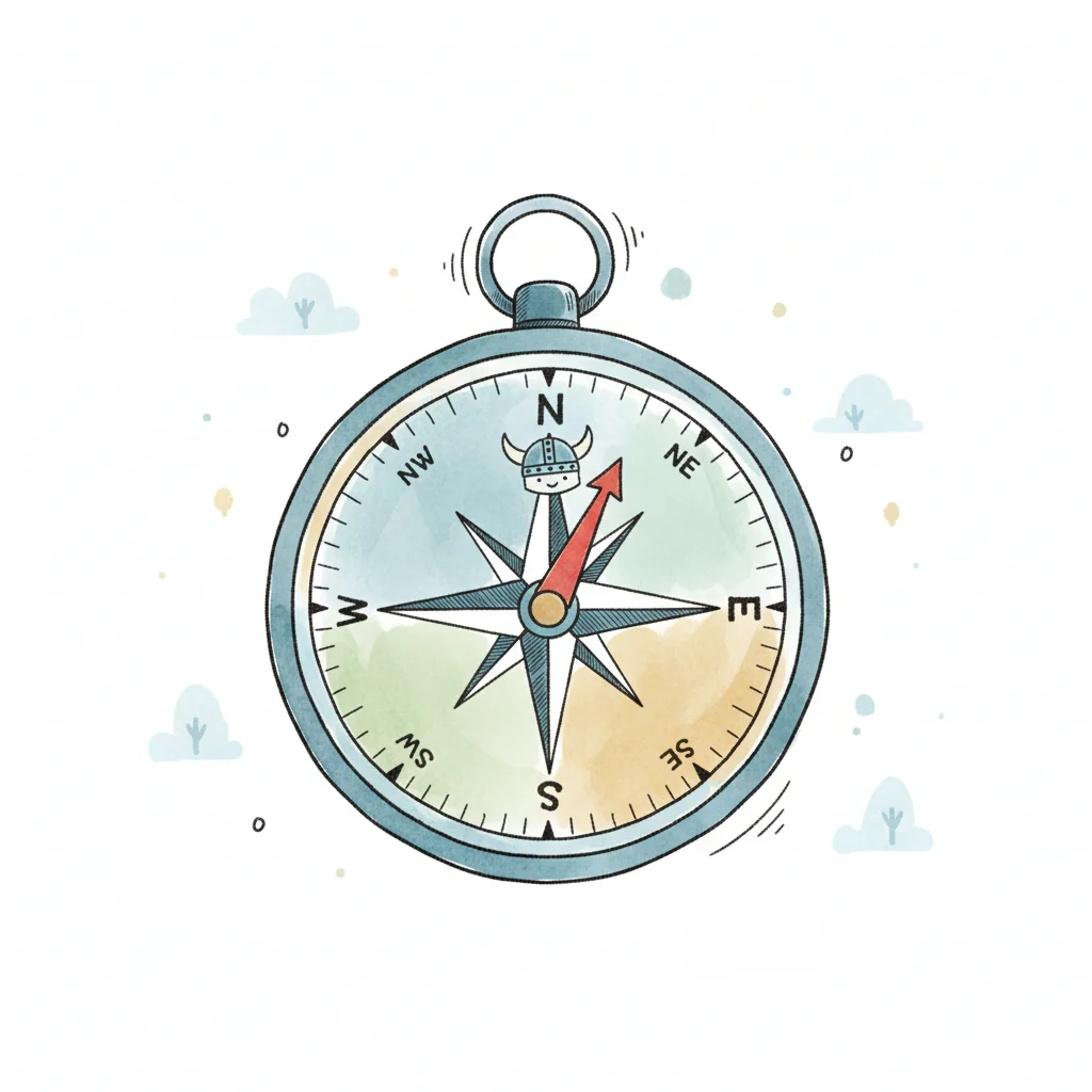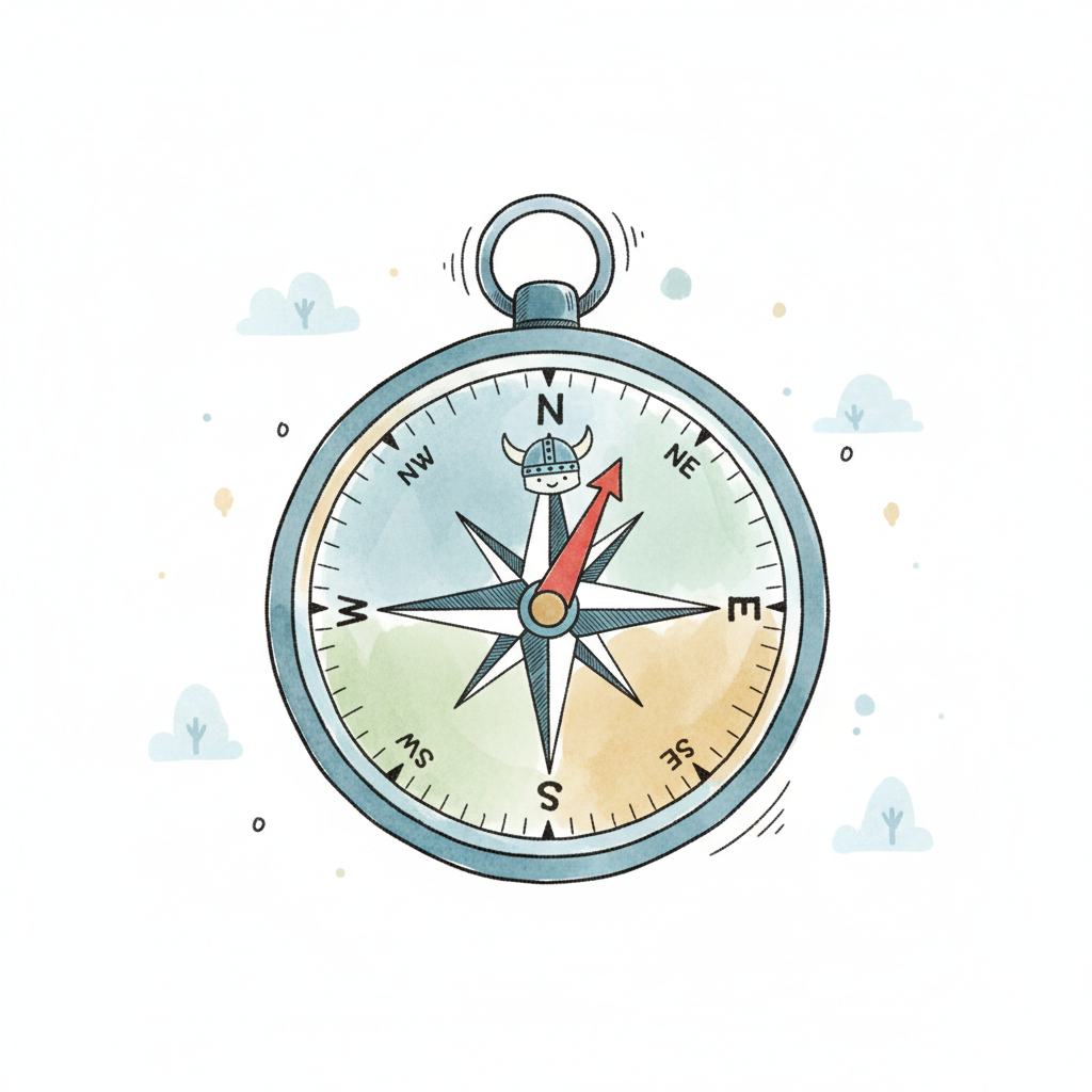 Niedlicher Aquarell-Kompass mit Wikinger-Gesicht auf N-Punkt, zeigt nach Nordosten.