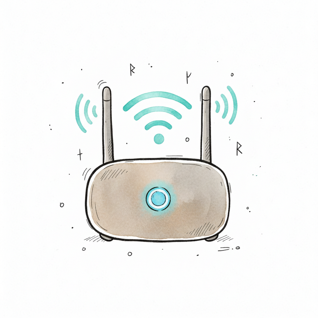 Handgezeichneter WLAN-Router mit leuchtenden Antennen und Wi-Fi-Signal in Aquarell-Optik.