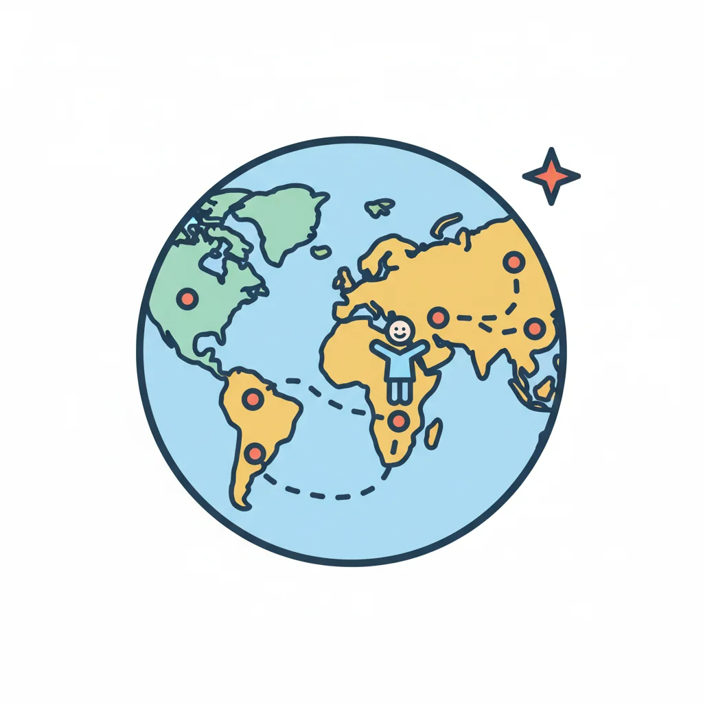 Globus mit Reiserouten, markierten Orten und einer glücklichen Person auf dem afrikanischen Kontinent.