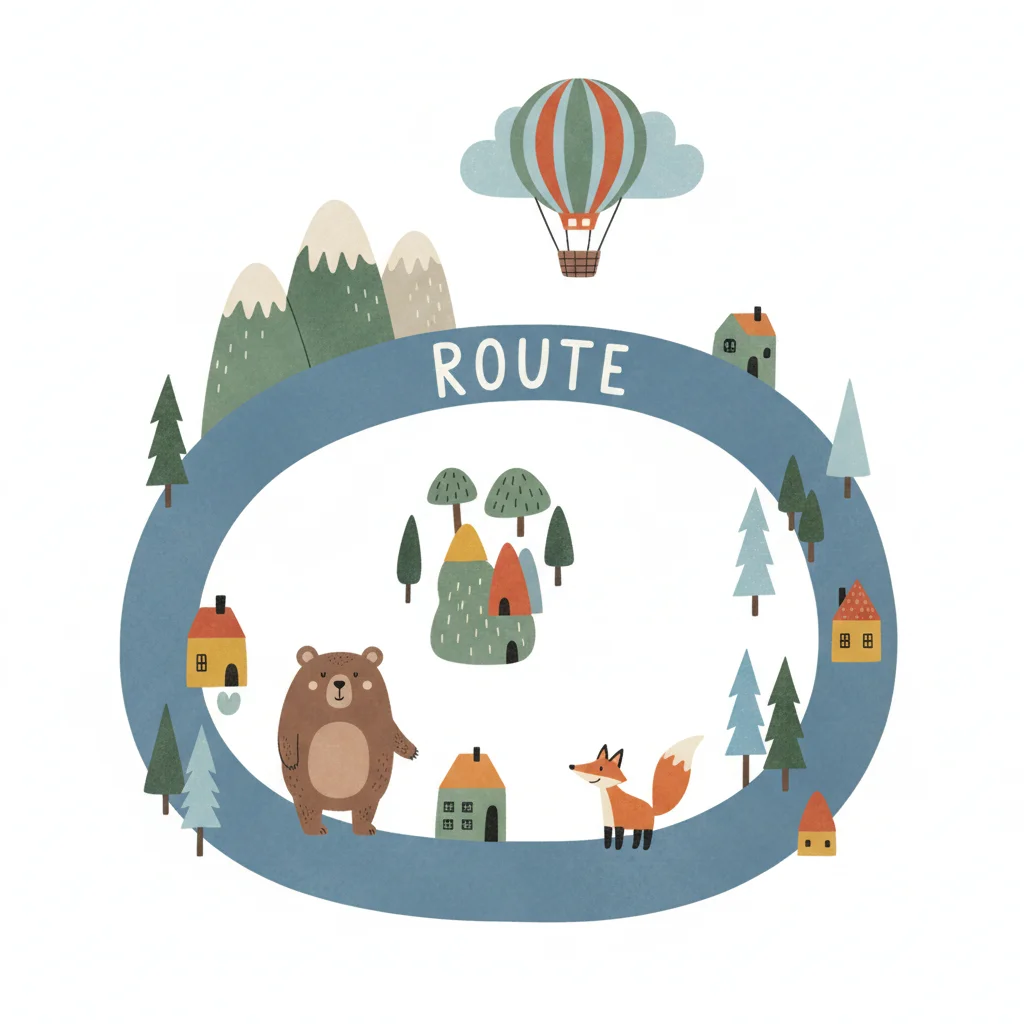 Niedliche Illustration einer Route mit Tieren, Häusern, Bäumen, Bergen und Heißluftballon.
