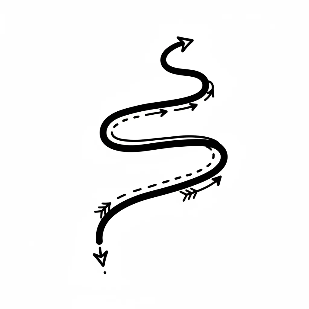 Schwarze, gewundene Linie mit Pfeilen und gestrichelter Nebenlinie auf weißem Hintergrund.