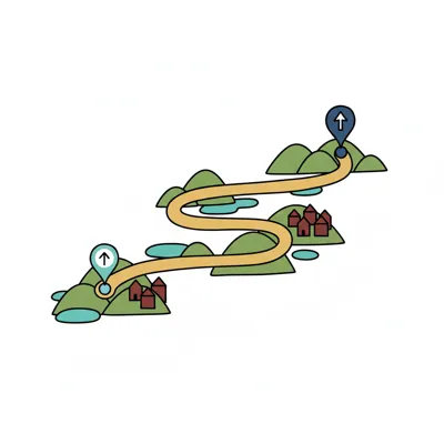 Stilisierte Karte mit gewundener Straße, Hügeln, Seen, Dörfern und markierten Start-/Endpunkten.