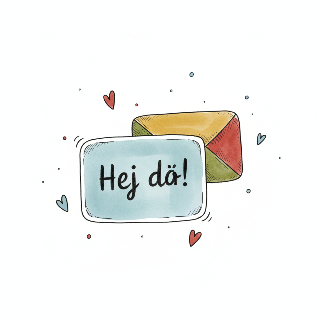Niedliche Aquarell-Illustration mit 'Hej dä!' Sprechblase, Brief und Herzen auf weißem Grund.