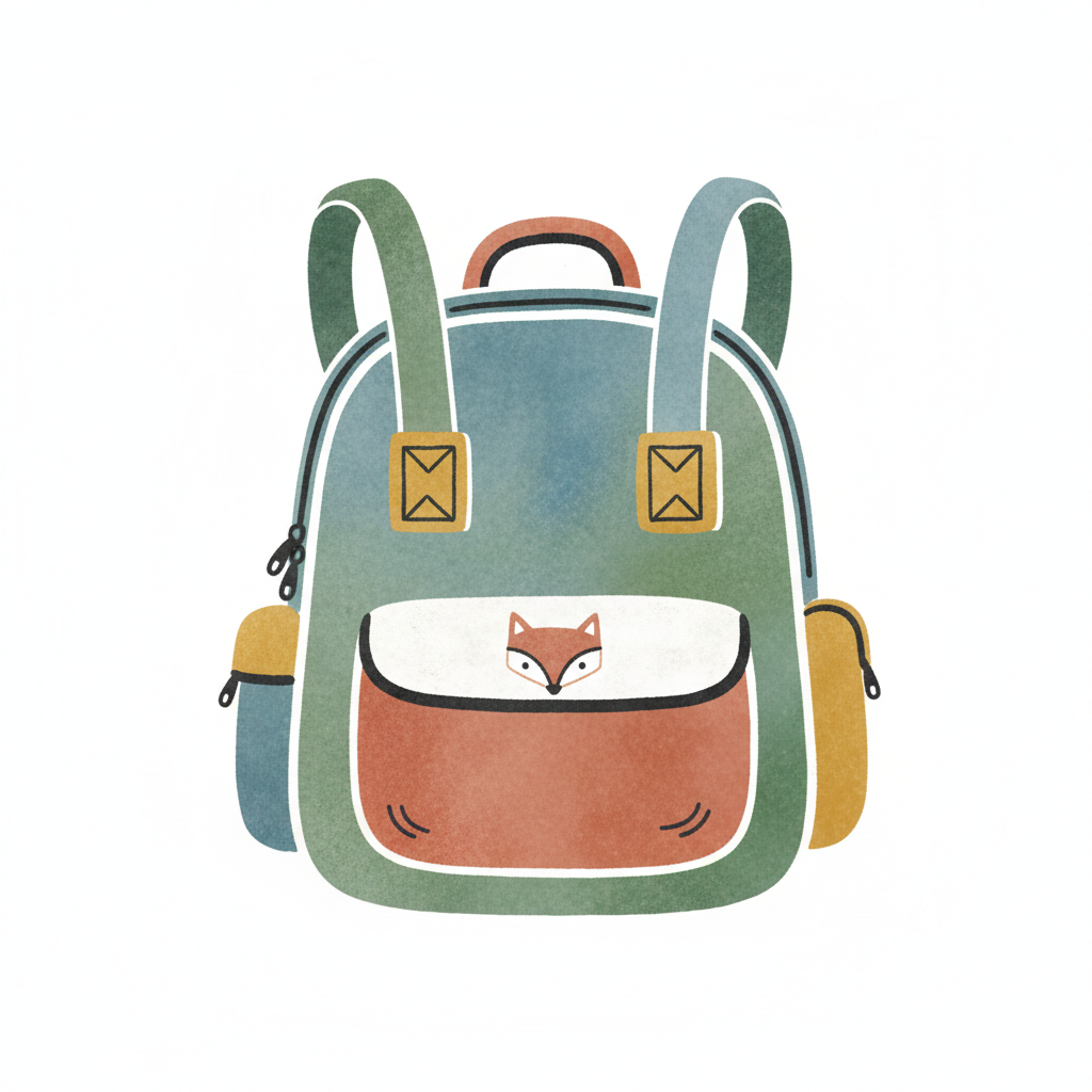 Bunter Rucksack mit einem kleinen Fuchs auf der Vorderseite.