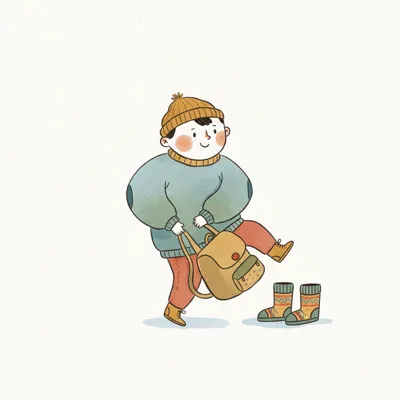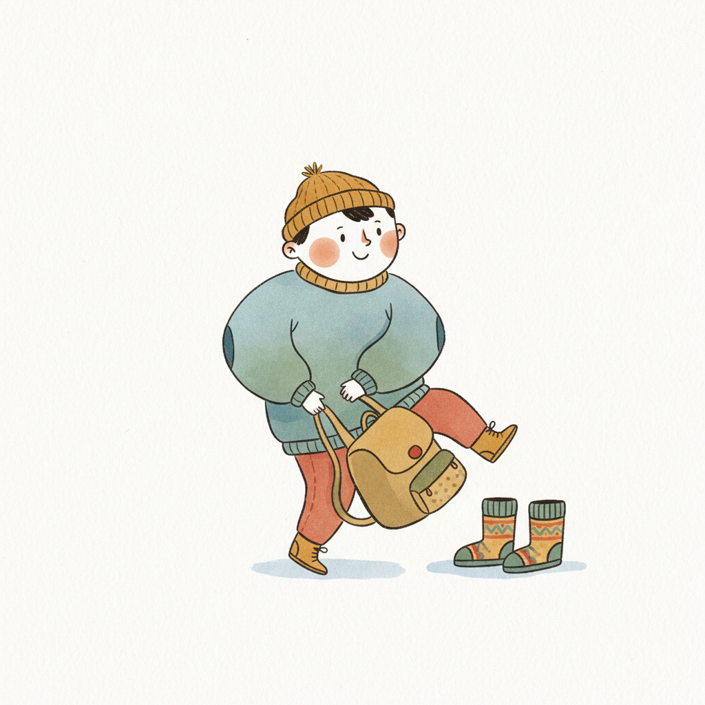 Handgezeichnete Kinderbuchillustration im modernen skandinavisch-nordischen Stil. Minimalistische, freundliche Figur mit einfachen Formen und leicht unregelmäßigen, handgezeichneten Linien. Ruhige, gedeckte Farbpalette, viel freie Fläche, reduzierte Details, sanfte Papier- oder Aquarellstruktur. Warme, ruhige, leicht humorvolle Stimmung, flächige Komposition ohne starke Perspektive, moderner nordischer Illustrationsstil, charmant und zeitlos.