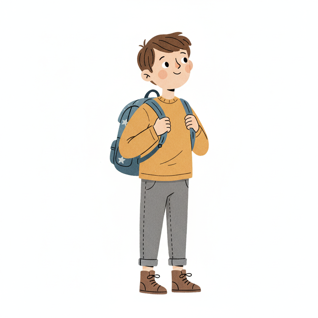Ein Junge mit Rucksack, lächelnd und bereit für Abenteuer.