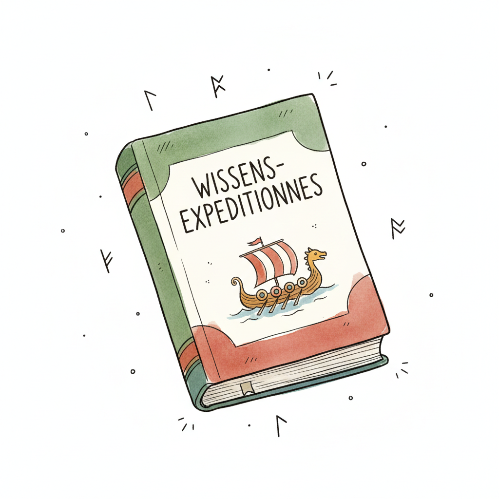 Ein illustriertes Buch "Wissens-Expeditionnes" mit Wikingerschiff auf dem Cover, umgeben von Runen.