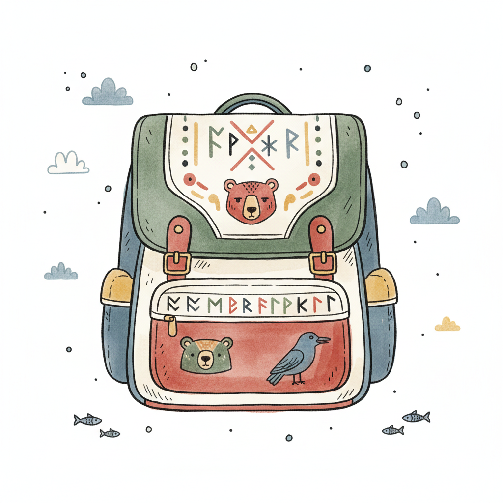 Bunter, handgezeichneter Rucksack mit Bären, Vogel und Runen in Aquarell-Optik.