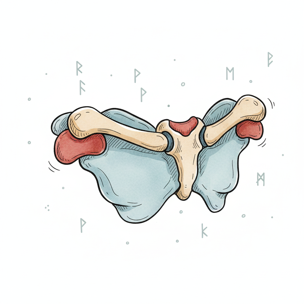 Stilisierte Illustration eines Knochengerüsts mit roten Knorpelelementen und Runen im Hintergrund.