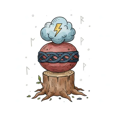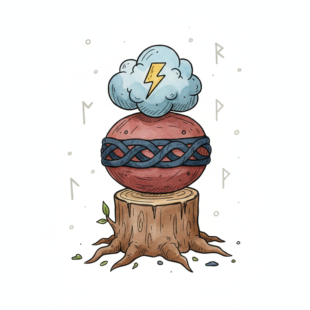 Aquarell-Illustration: Baumstumpf, rote Kugel mit Band, Gewitterwolke und Runen im Hintergrund.