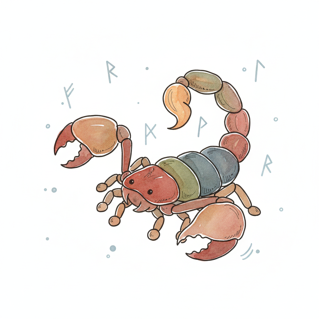 Bunter Cartoon-Skorpion im Aquarellstil mit Runen und Punkten im Hintergrund.