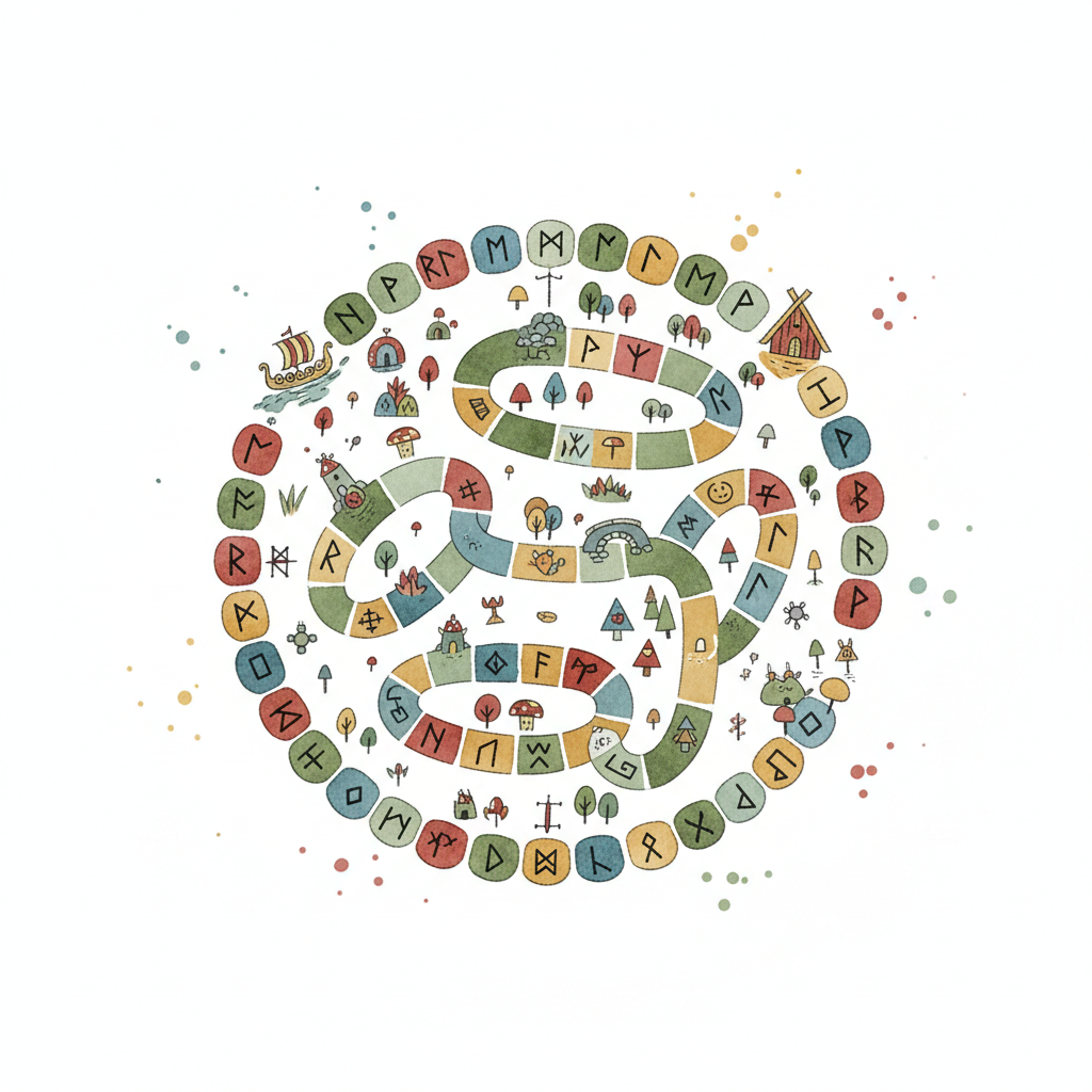 Ein verspieltes Aquarell-Brettspiel mit gewundenem Pfad, Runen, Wikingerschiff und Fantasylandschaft.