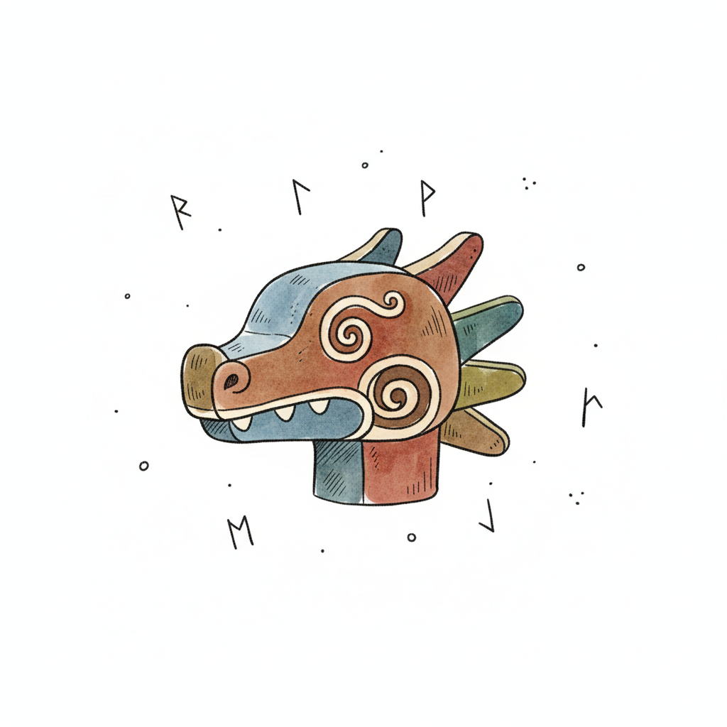 Stilisierter Drachenkopf in Aquarellfarben, umgeben von Runen und Punkten auf weißem Grund.