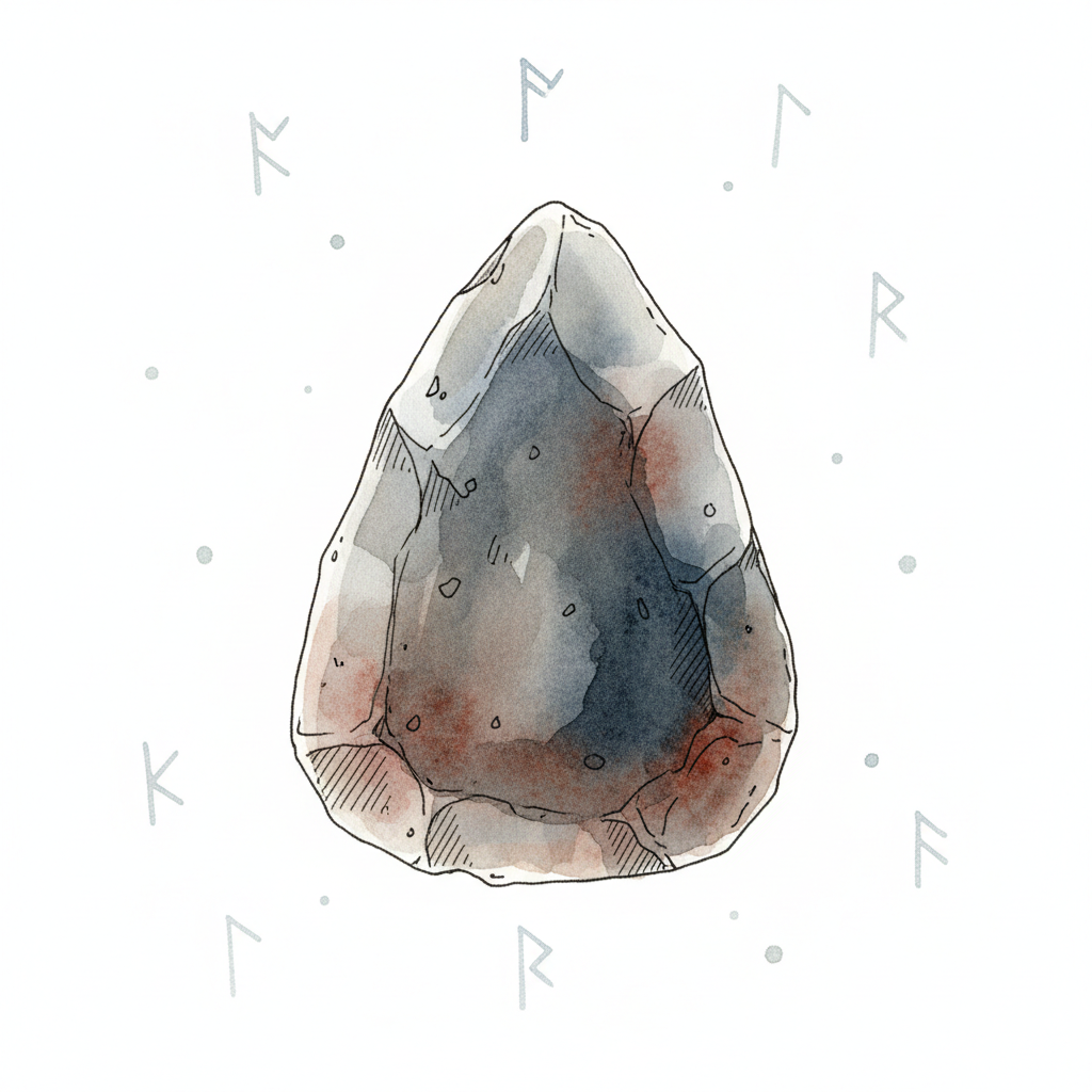 Aquarellzeichnung eines prähistorischen Faustkeils, umgeben von Runen und Punkten.