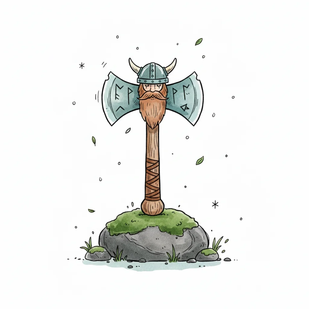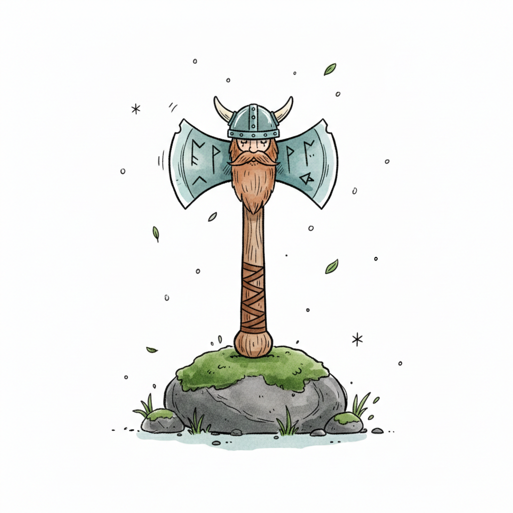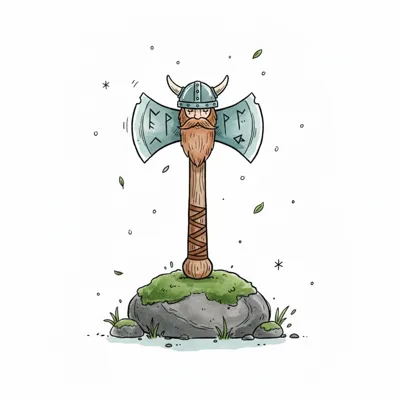 Illustrierte Doppelaxt mit Wikingergesicht und Helm, steckt in moosigem Felsen, Runen auf Klingen.