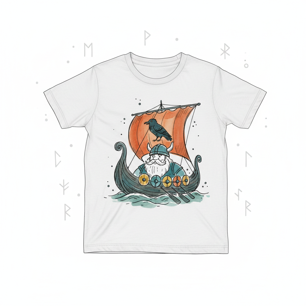 Weißes T-Shirt mit Cartoon-Viking in Langschiff, Rabe auf Segel, umgeben von Runen.