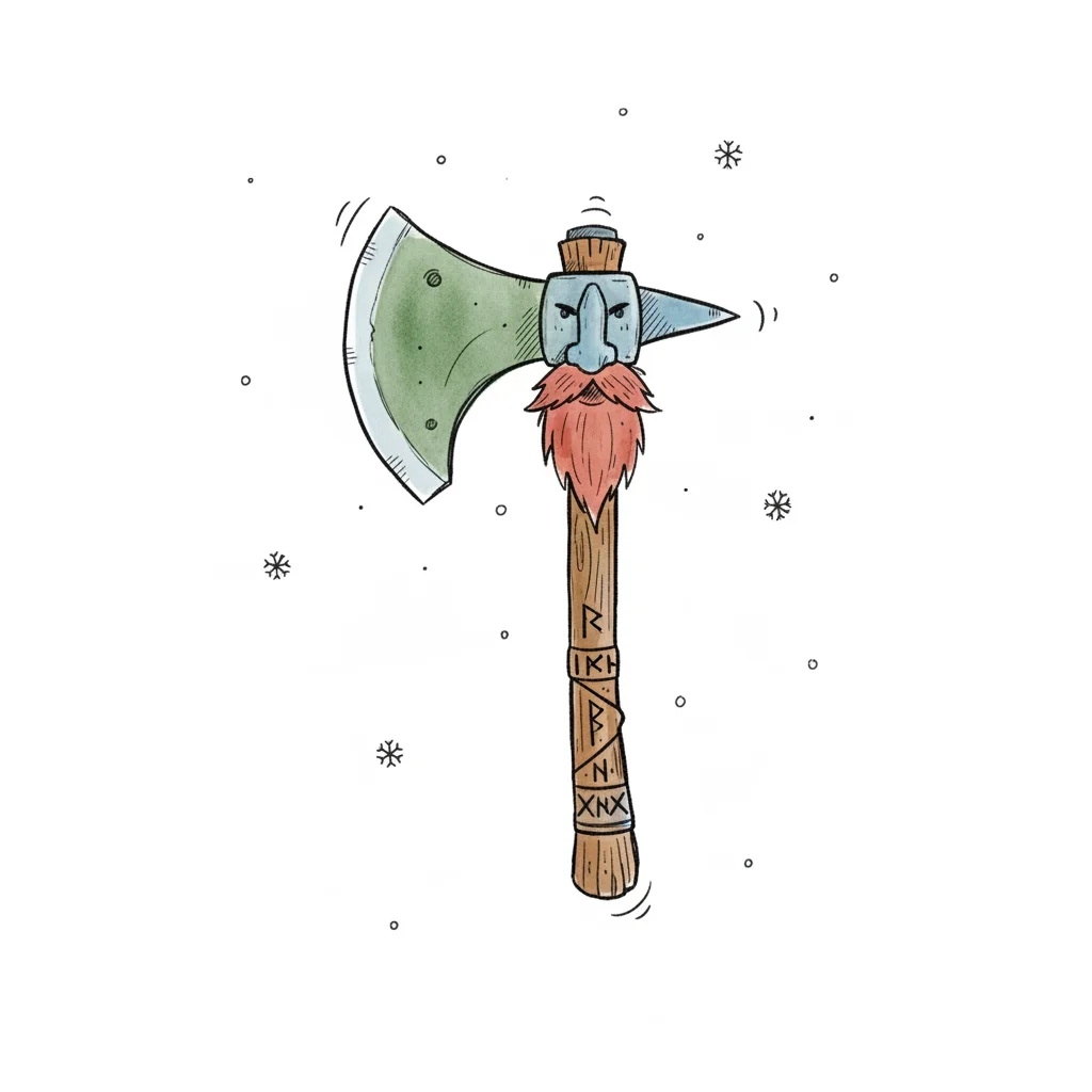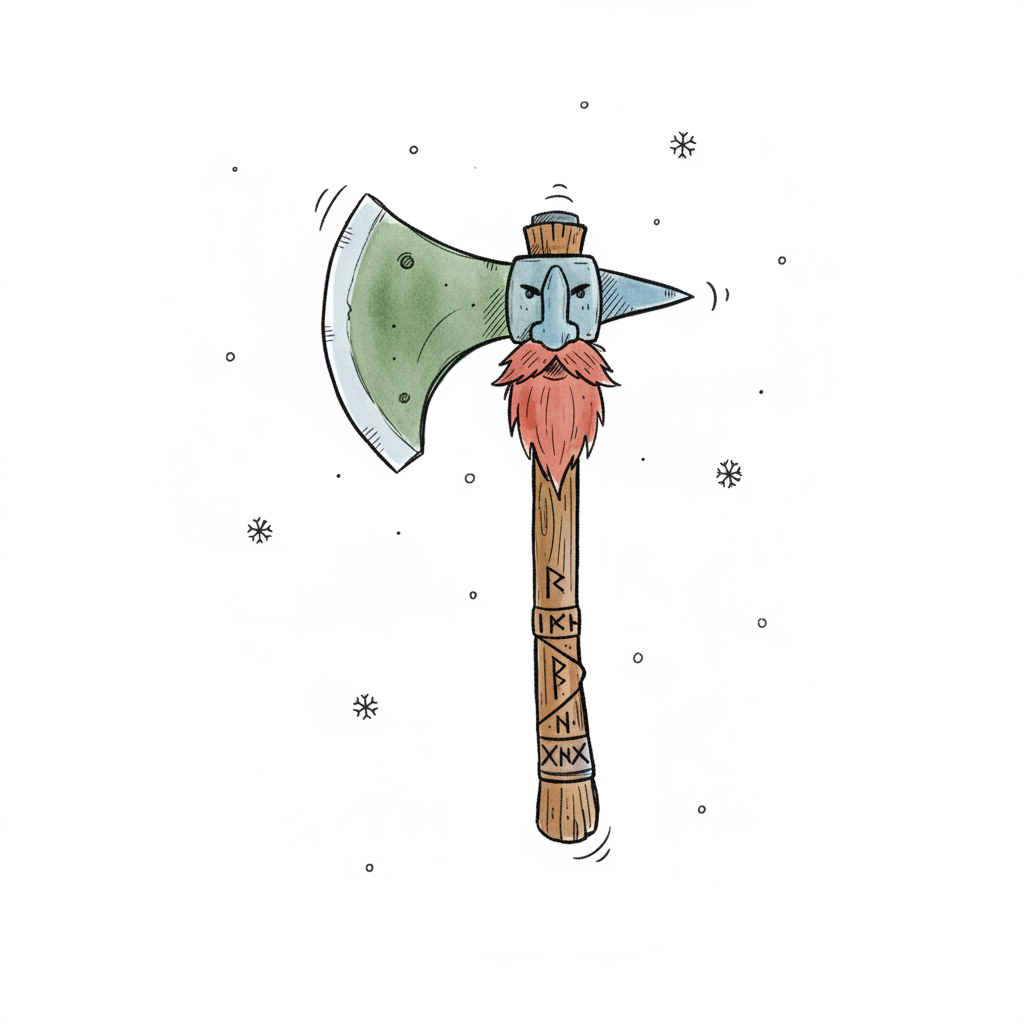 Illustrierte Axt mit Zwergengesicht, rotem Bart und Runen auf dem Griff, umgeben von Schneeflocken.