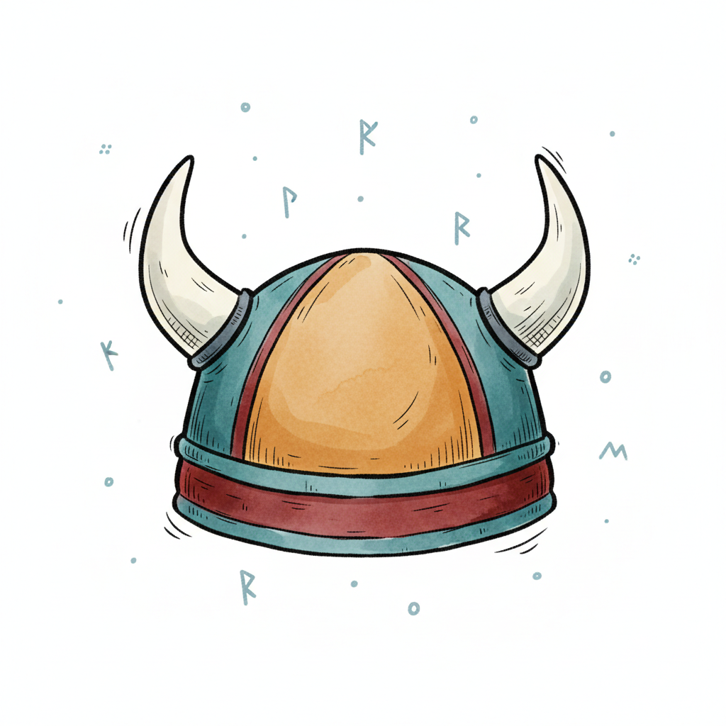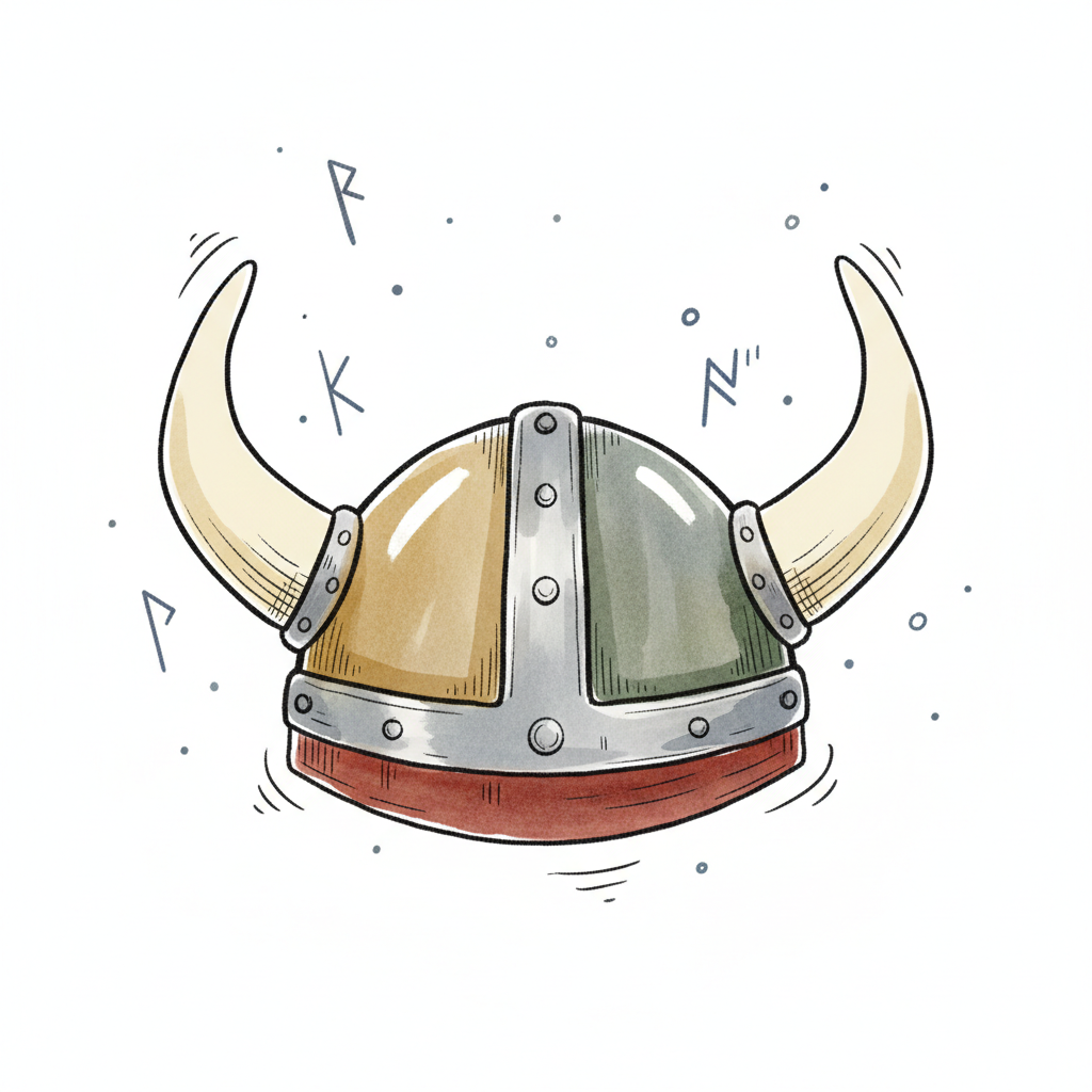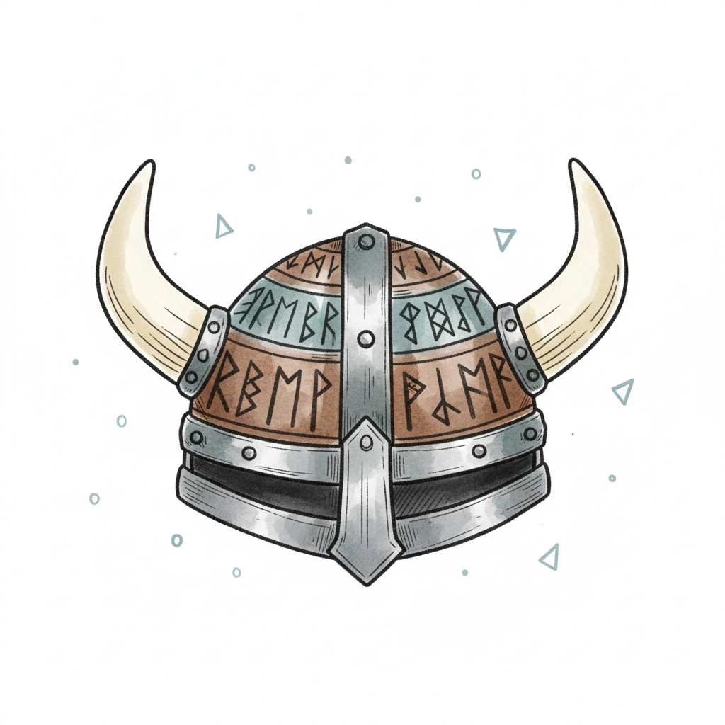 Illustrierter Wikingerhelm mit Hörnern und Runen im Hintergrund, gezeichnet im Cartoon-Stil.