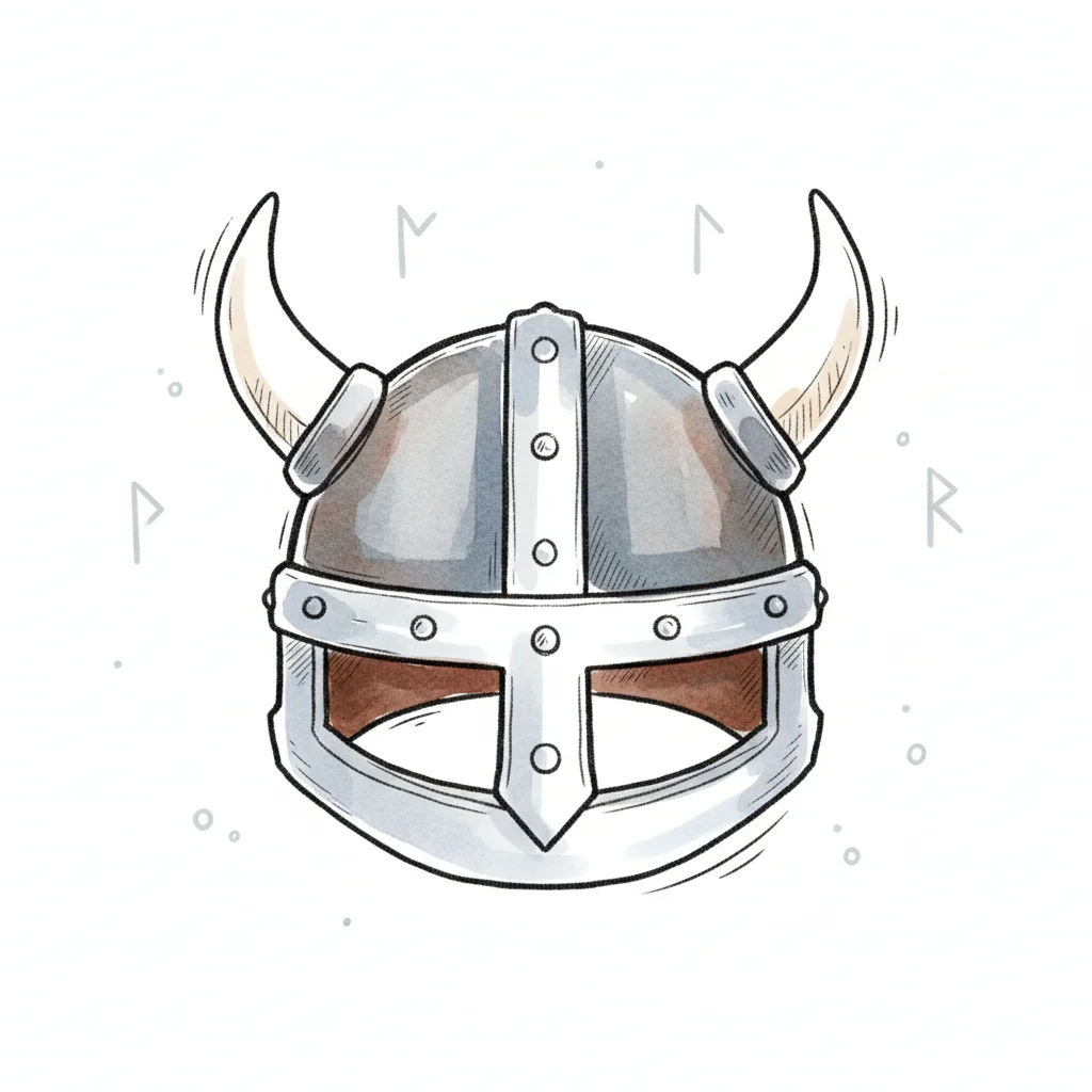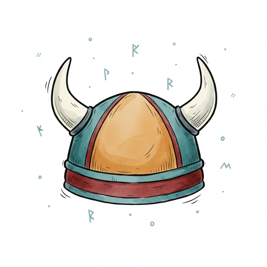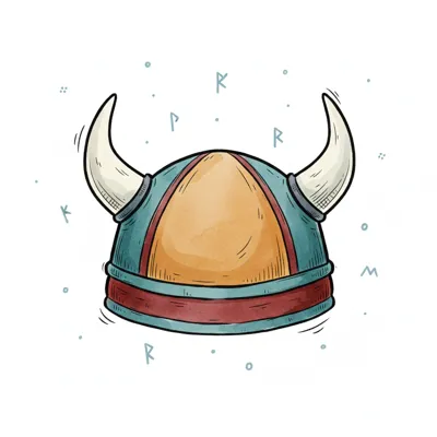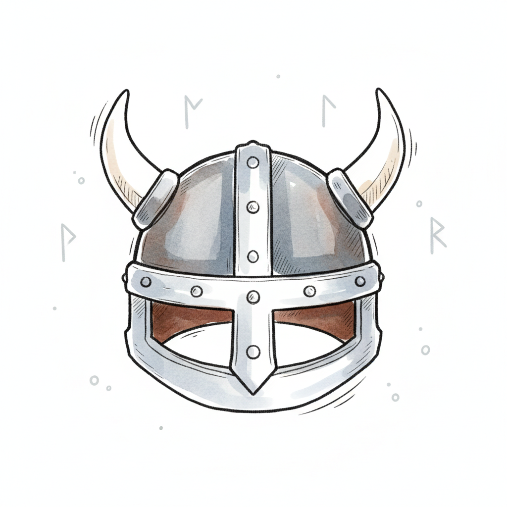 Illustrierter Wikingerhelm mit Hörnern und Runen im Hintergrund, gezeichnet im Cartoon-Stil.