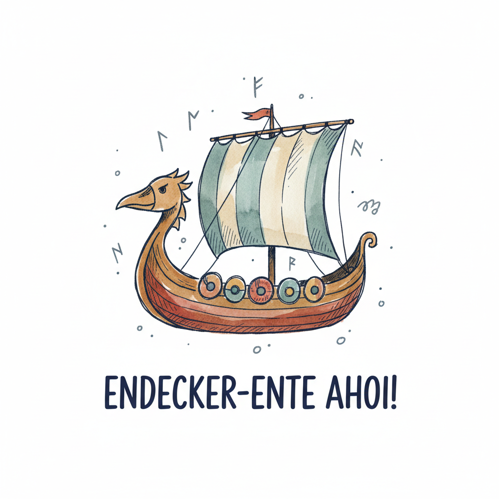 Niedliches Wikingerschiff mit Entenkopf, Segel und Runen. Text: ENDECKER-ENTE AHOI!